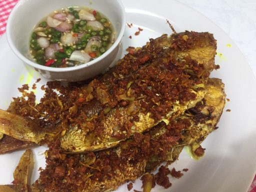 - ตักปลาที่ทอดเสร็จเรียบร้อย ใส่จาน โรวยด้วยกากเจียว เพิ่มเติมคือน้ำปลาพริกมะนาวแบบอร่อยสุดๆ อีก 1 ถ้วย
