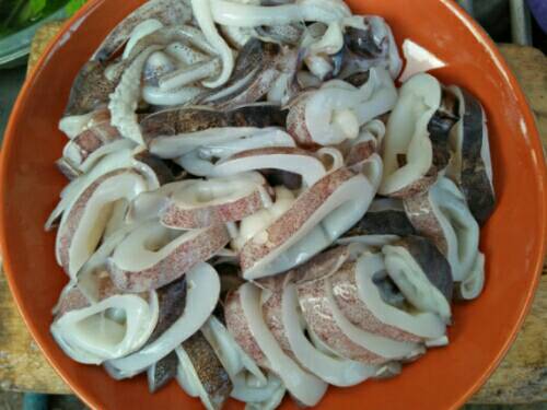 - เลือกหมึกสดๆ เนื้อแน่นๆ นะคะ แล้วนำมาล้างเกลือ นวดให้เนื้อปลาหมึกแข็งขึ้น แล้วล้างน้ำสะอาด 2-3 ครั้ง แล้วหั่นเป็นแว่นๆ จากนั้นนำไปลวกในน้ำเดือด 3 นาที พักไว้