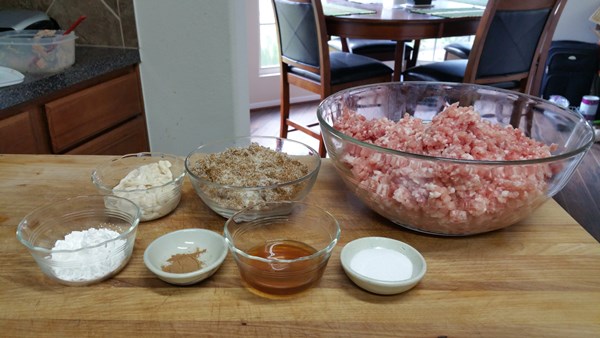 - เริ่มด้วยนำหมูบดมาใส่อ่างผสม และเทน้ำตาลทรายแดง (น้ำตาลทรายแดงทำให้กุนเชียงมีสีเข้มขึ้น)
