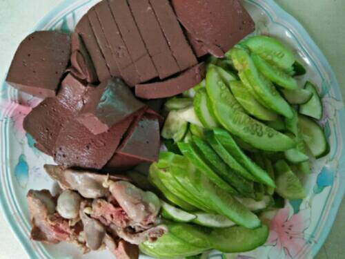 - เพิ่มเติมคือเลือดไก่ 1 ก้อน เครื่องในไก่ 2 พวง ต้มให้สุกแล้วนำมาหั่น จัดใส่จานพร้อมแตงกวา จะช่วยให้ข้าวมันไก่จานนี้สมบูรณ์แบบยิ่งขึ้น