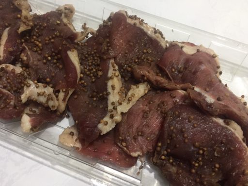 - แล่เนื้อเป็นแผ่นไม่หนา ไม่บางเกินไป ซับน้ำให้แห้ง ผึ่งลมไว้